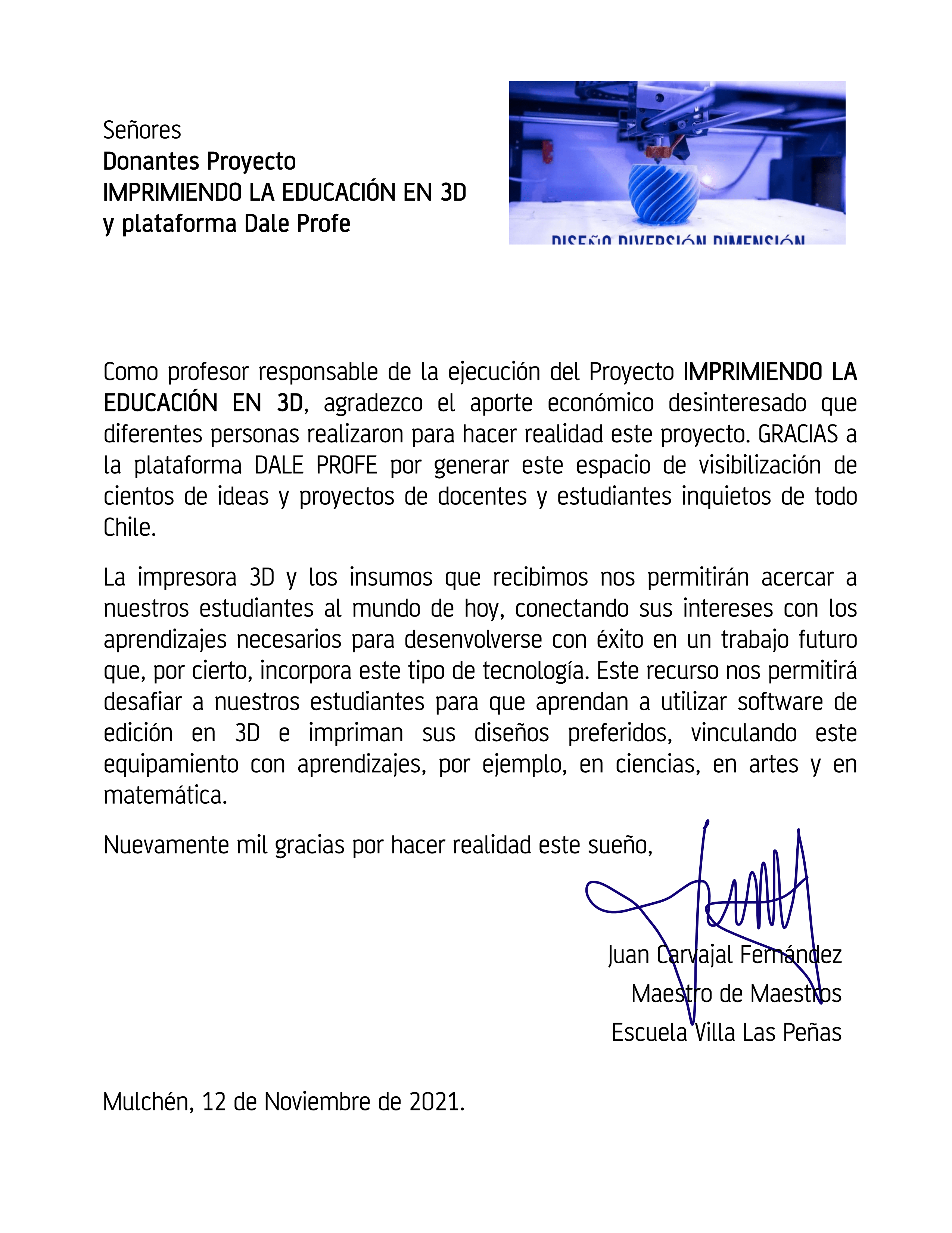 El proyecto considera adquirir una impresora 3D para acercar a nuestros estudiantes al mundo de hoy, conectando sus intereses con los aprendizajes necesarios para desenvolverse con éxito en un trabajo futuro. La idea es que a través de la impresión de sus personajes favoritos de juegos, de objetos funcionales, productos de merchandising como tazones, porta lápices, galvanos, trofeos, y otros, ademas de piezas de lego y colgadores, puedan conocer cómo funciona la tecnología 3D, aprendizajes vinculados a ciencias (tipos de materiales, cómo la temperatura les afecta, cambios de estado de la materia, etc.) y matemática (Movimiento en el plano 3D, eje "x" y eje "y", rotaciones, traslaciones, reflexiones, área, volumen, entre otros). Además conocerán el manejo de programas de diseño 2D y 3D, conectando la tecnología y conociendo com esta impacta en diversos ámbitos de la vida e (cocina, hogar, educación, etc.).