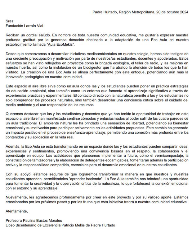 Este proyecto pretende adaptar un espacio al costado de un invernadero, que cuenta con un huerto de lechugas hidropónicas, permitiendo tener un aula al aire libre conectada a este otro lugar. En esta Eco Aula se realizarán diversas acciones al aire libre y en contacto con la naturaleza, para lograr variadas habilidades y actitudes en nuestros estudiantes, aplicando propuestas metodológicas de la educación ambiental en todas las asignaturas y niveles, como: huerto, energías sustentables, mindfulness, cuidado del medio ambiente, entre otras. Lo cual permitirá mejorar la forma en la que se relacionan con su entorno.