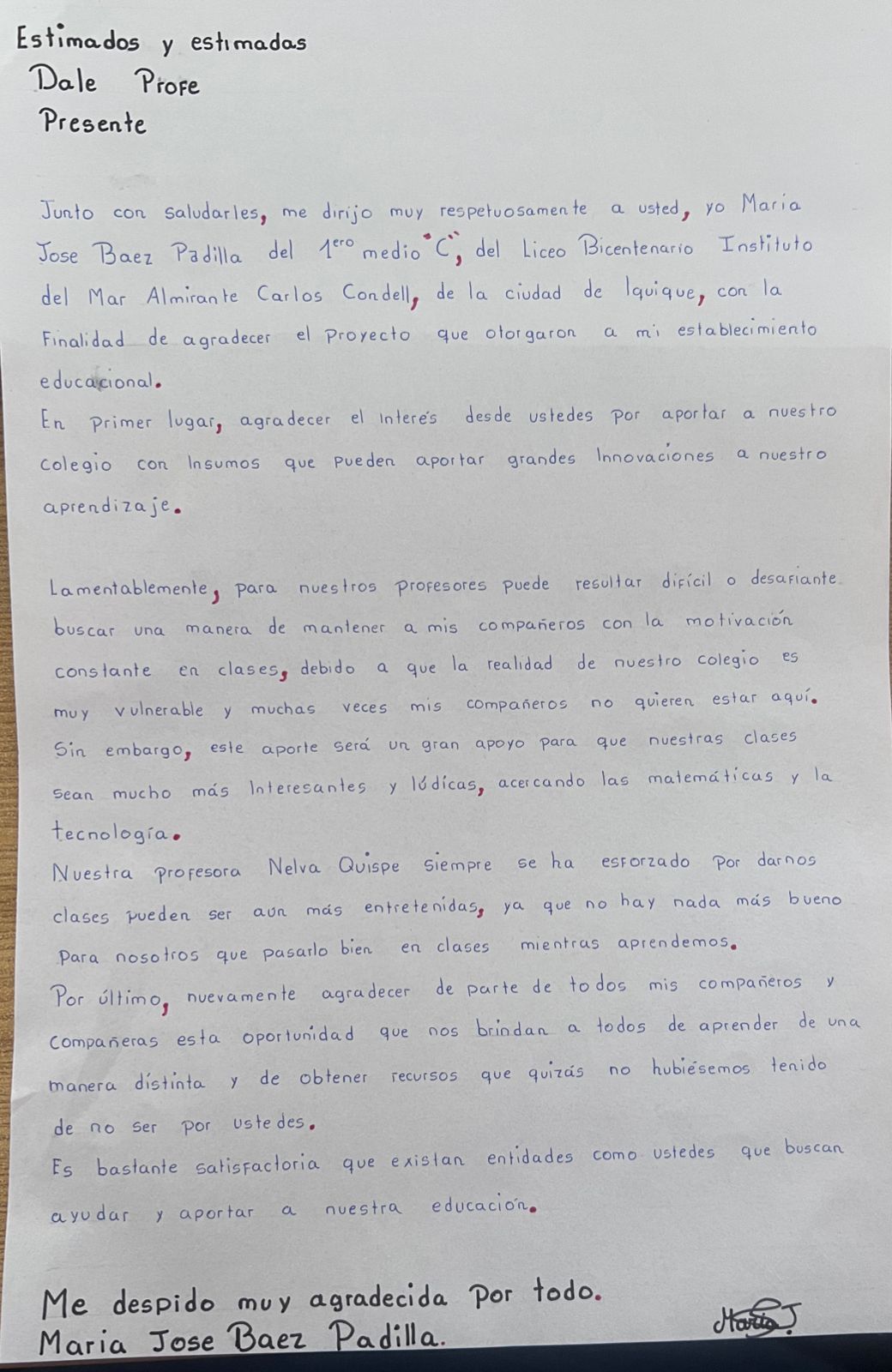 Mis estudiantes son grandes guerreros, llenos de esperanza, amor, energía, curiosos que me llenan de esperanza. Son un grupo de estudiantes organizados, les encantan los desafíos, respetuosos con todos y siempre están pendiente de los demás. Son un grupo de chicos que requieren mucho amor. Ellos provienen de comunidades de caletas pesqueras, tomas en la comuna de Alto Hospicio y de la ciudad de Iquique, conviven con realidades socioculturales vulnerables. Ellos sueñan con la realidad en 3D y aumentada, imprimir sus ideas, visualizar sus creaciones y comprender haciendo.
