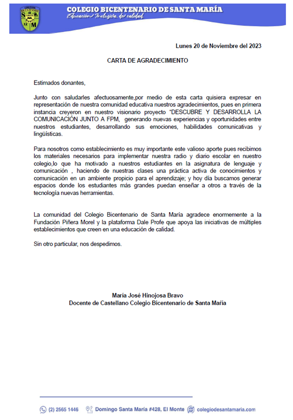 Mis estudiantes del Colegio Bicentenario de Santa María pertenecen a un sector rural de la comuna de El Monte, en un contexto de altos índices de vulnerabilidad económica, social, afectiva y cultural. Sin embargo, muestran constante interés y curiosidad por aprender nuevas metodologías en el área de lenguaje, así como también de investigar e implementar medios de comunicación que beneficien a la comunidad educativa