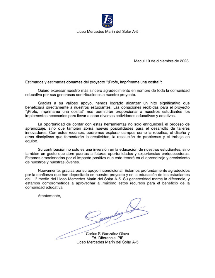 El proyecto "!Profe me imprime una cosita!" busca enriquecer la experiencia educativa de los y las alumnas mediante actividades curriculares que utilizan tecnologías de impresión. Se emplearán impresoras multifuncionales e impresoras 3D, junto con insumos como filamentos y papel. Los estudiantes podrán diseñar y crear objetos en 3D relacionados con diversas materias, como modelos moleculares en ciencias, figuras geométricas en matemáticas y réplicas históricas en historia.