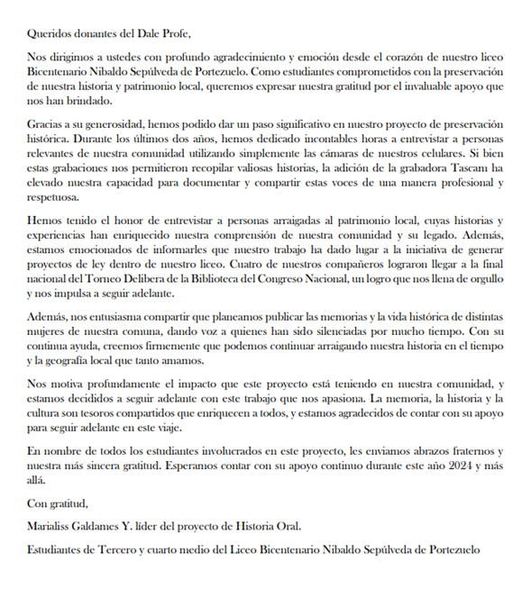 Nuestros estudiantes entrevistarán a 10 mujeres destacadas en la tradicionalidad de Portezuelo. fotografiarán a estas mujeres y solicitaran sus archivos personales para su escaneo. De esta forma, preservaremos y difundiremos su legado, que enriquecerán nuestra comprensióon sobre el pasado y su impacto en la comunidad actual.