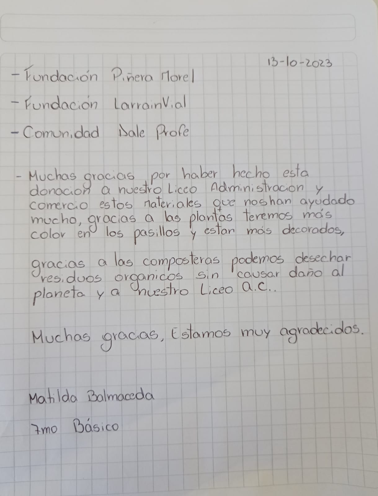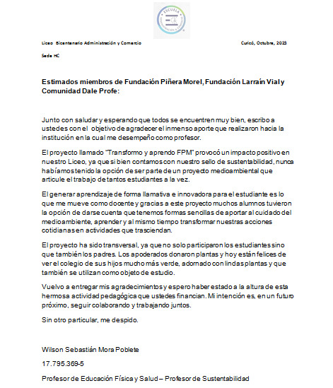 Mis estudiantes son respestuosos con los docentes, son cariñosos entre ellos y empáticos con su entorno, esto genera un grato ambiente en el establecimiento educacional.